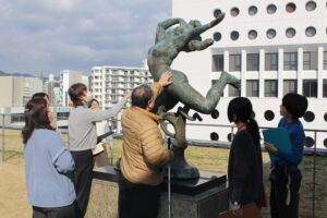 美術館の作品は、作品保護の観点から触れないことがほとんどですが、長崎県美さんの屋上にある彫刻作品は触っても大丈夫ということで、触っての美術鑑賞にもチャレンジしました。